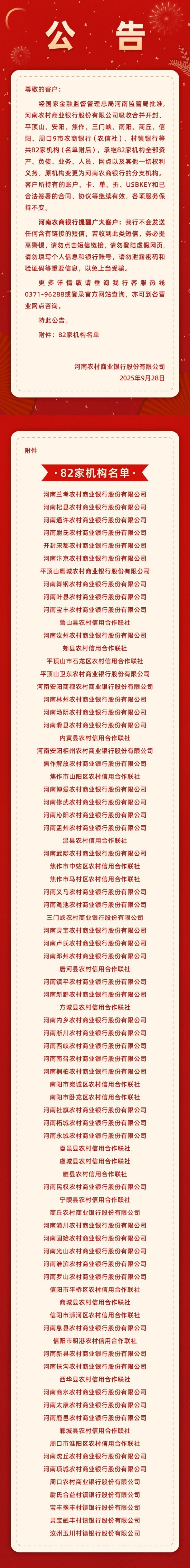 9月28日金融一线消息,河南农商银行今日发布公告称,经国家金融监督管理总局河南监管局批准河南农村商业银行股份有限公司吸收合并开封、平顶山、安阳、焦作、三门峡、南阳、商丘、信阳、周口9市农商银行(农信社)、村镇银行等共82家机构(名单附后),承继82家机构全部资产、负债、业务、人员、网点以及其他一切权利义务优益配资,原机构变更为河南农商银行的分支机构。客户所持有的账户、卡、单、折、USBKEY和已合法签署的合同、协议等继续有效,各项服务保持不变。